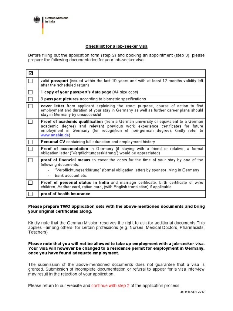 Germany Job Seeker Visa Checklist I Am Aptech Visa Global Immigration Services Pvt Ltd Facebook from lookaside.fbsbx.com It is valid for six months, during which time you have to look for and find work. The job seeker visa allows you to come to germany and look for a job 1. You can find complete information regarding visit visa, tourist visa, work visa, dual citizenship and residencies of all countries. Once you have found a job, you can then submit your application for the work and residence permit. The job seeker visa does not allow you to work in germany. Germany has an excellent public (statutory) healthcare system, whereby all residents can access comprehensive medical care. These documents play a vital role in making the first impression on the employer and presenting you as a strong contender for the available vacancy. To search for jobs in canada, you must prepare a resume as per the canadian job market along with an attractive cover letter.